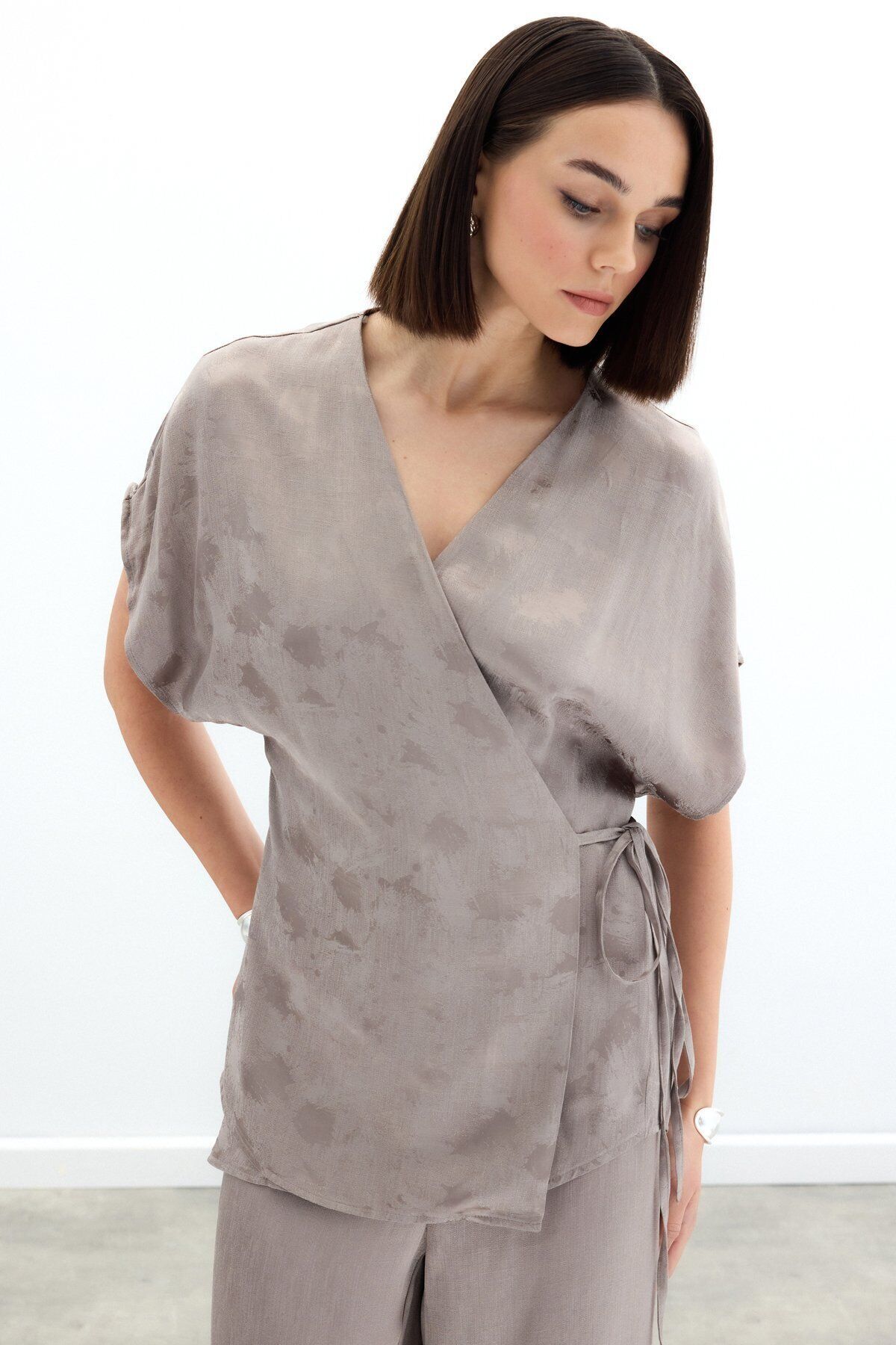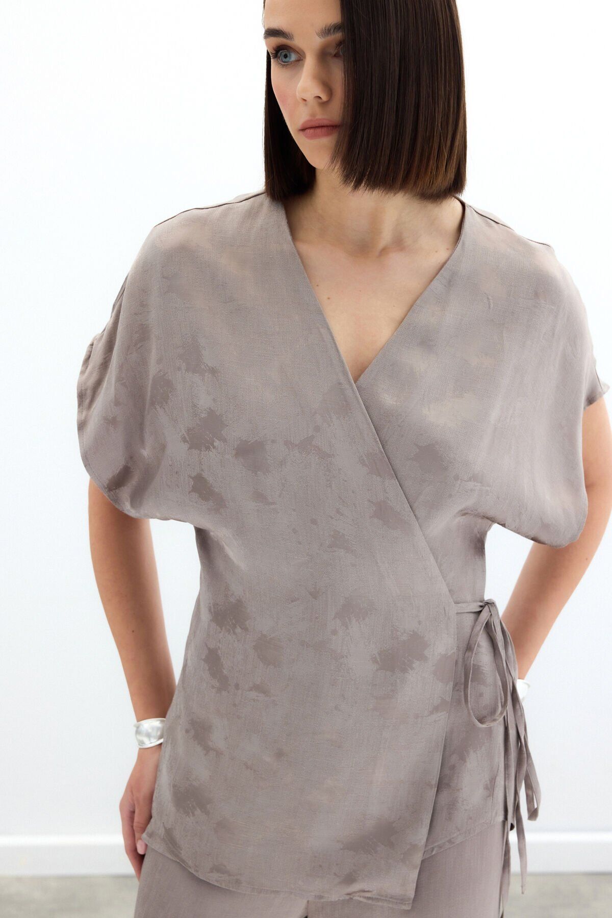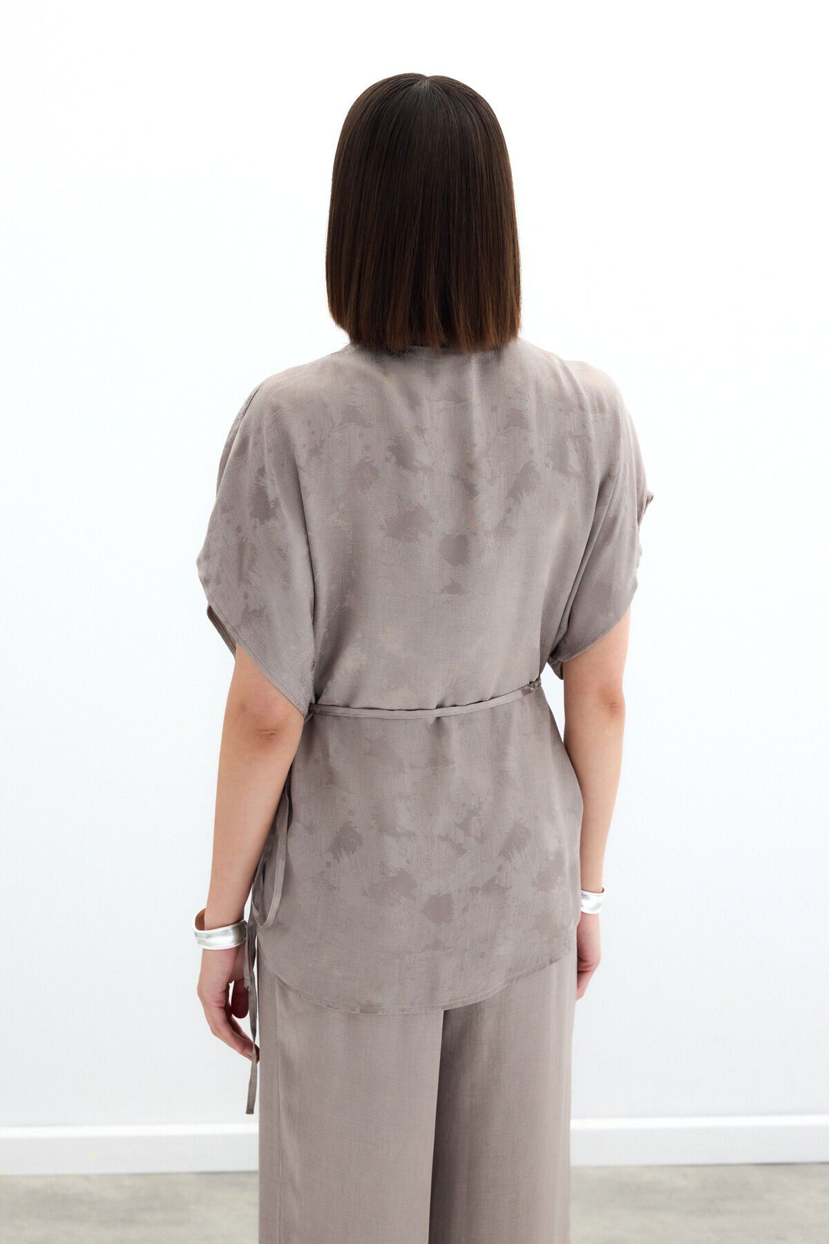 Bağlamalı Jakarlı Saten Bluz