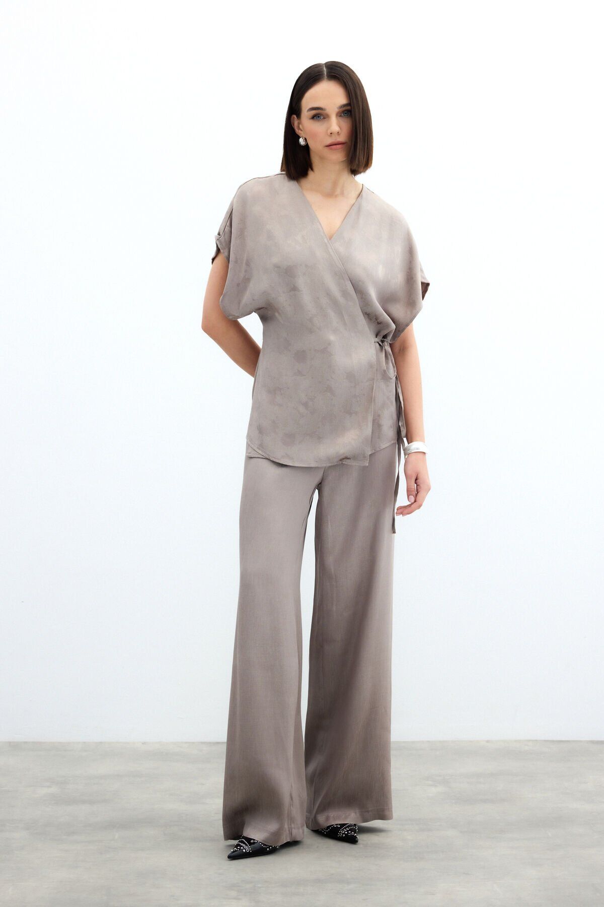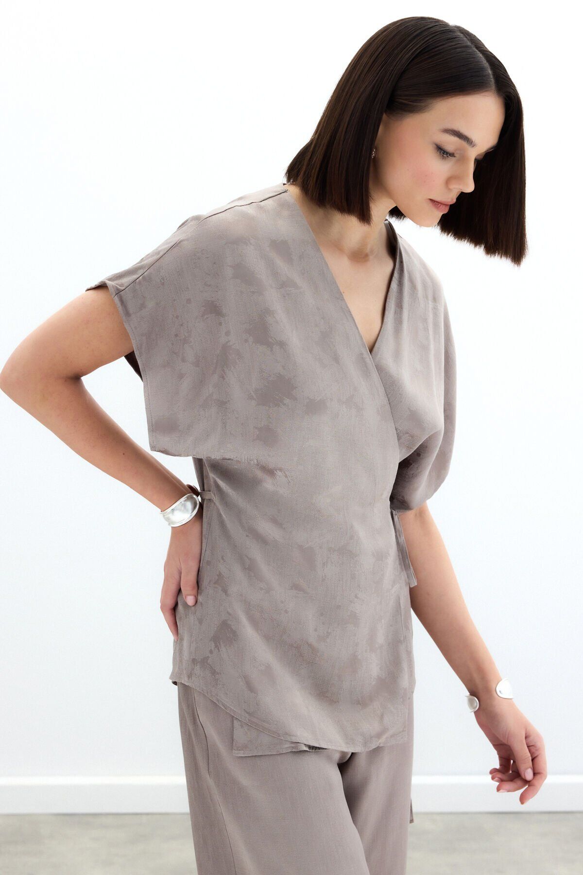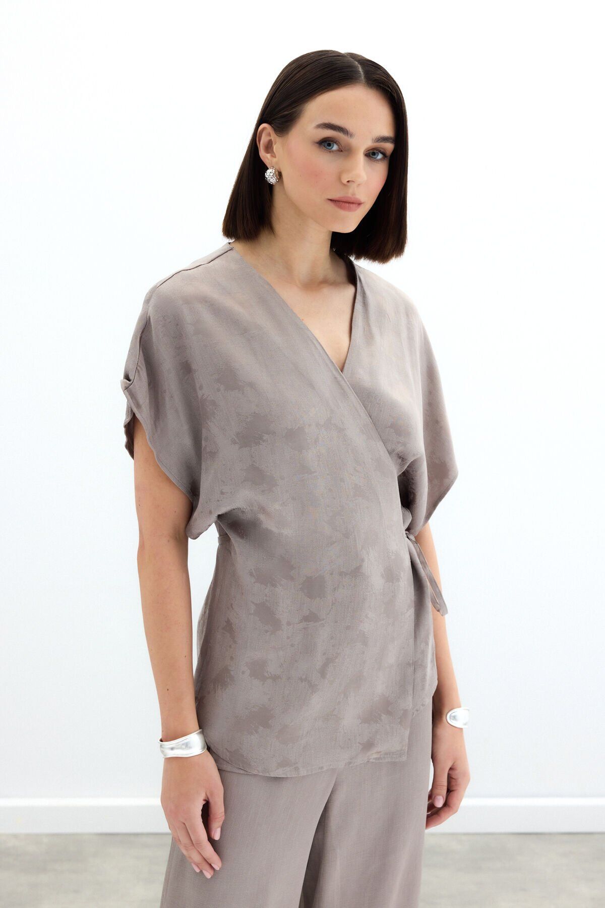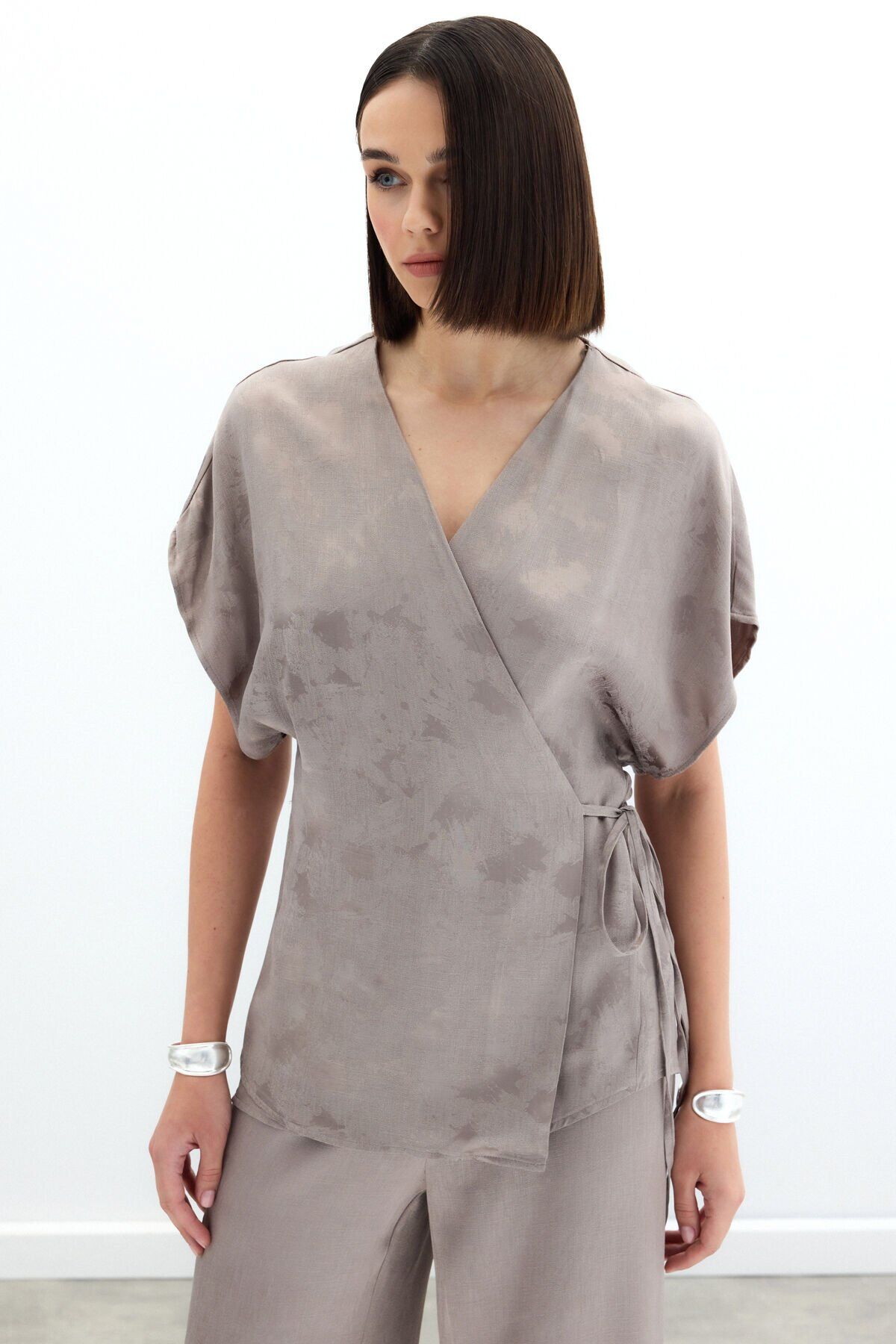 Bağlamalı Jakarlı Saten Bluz
