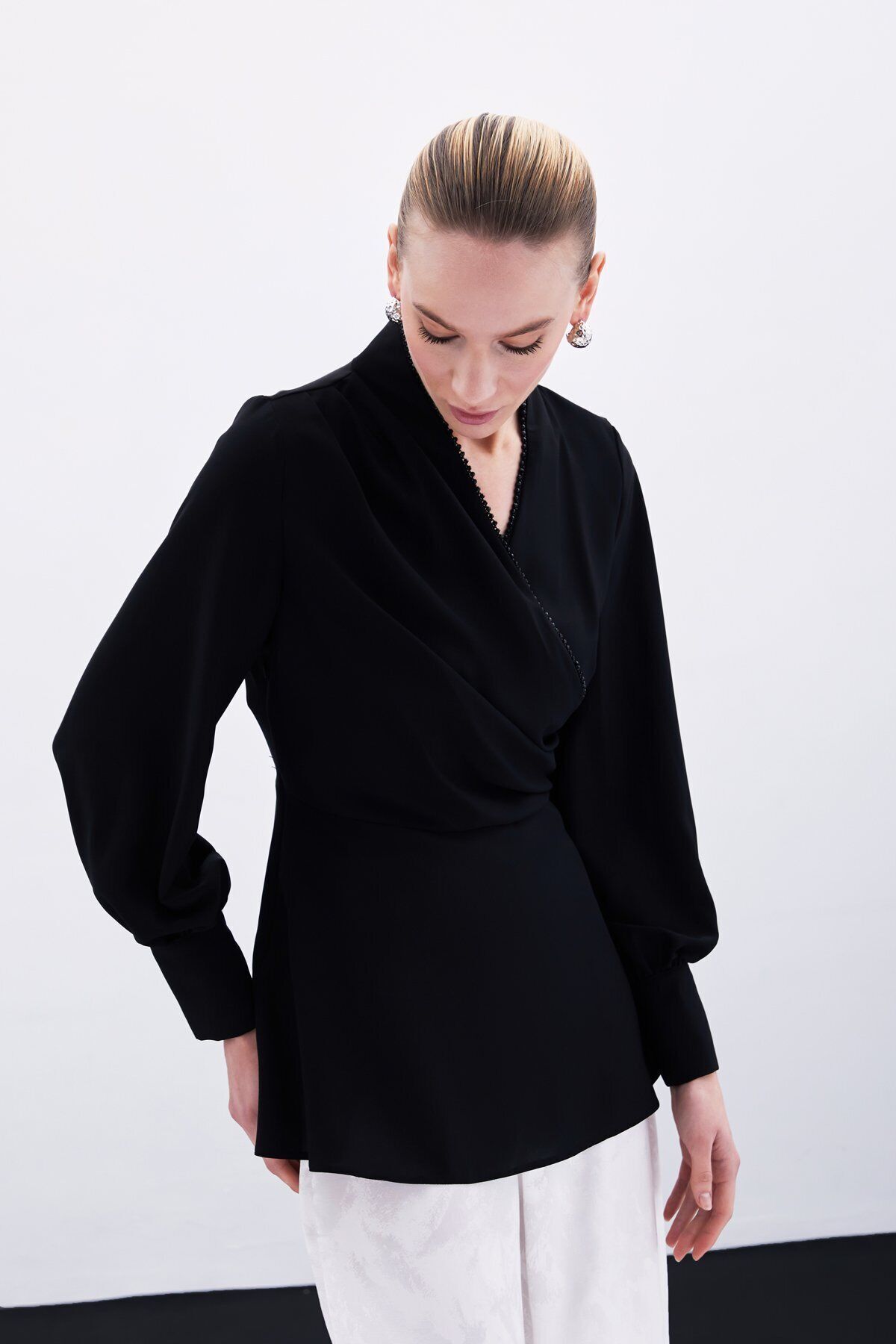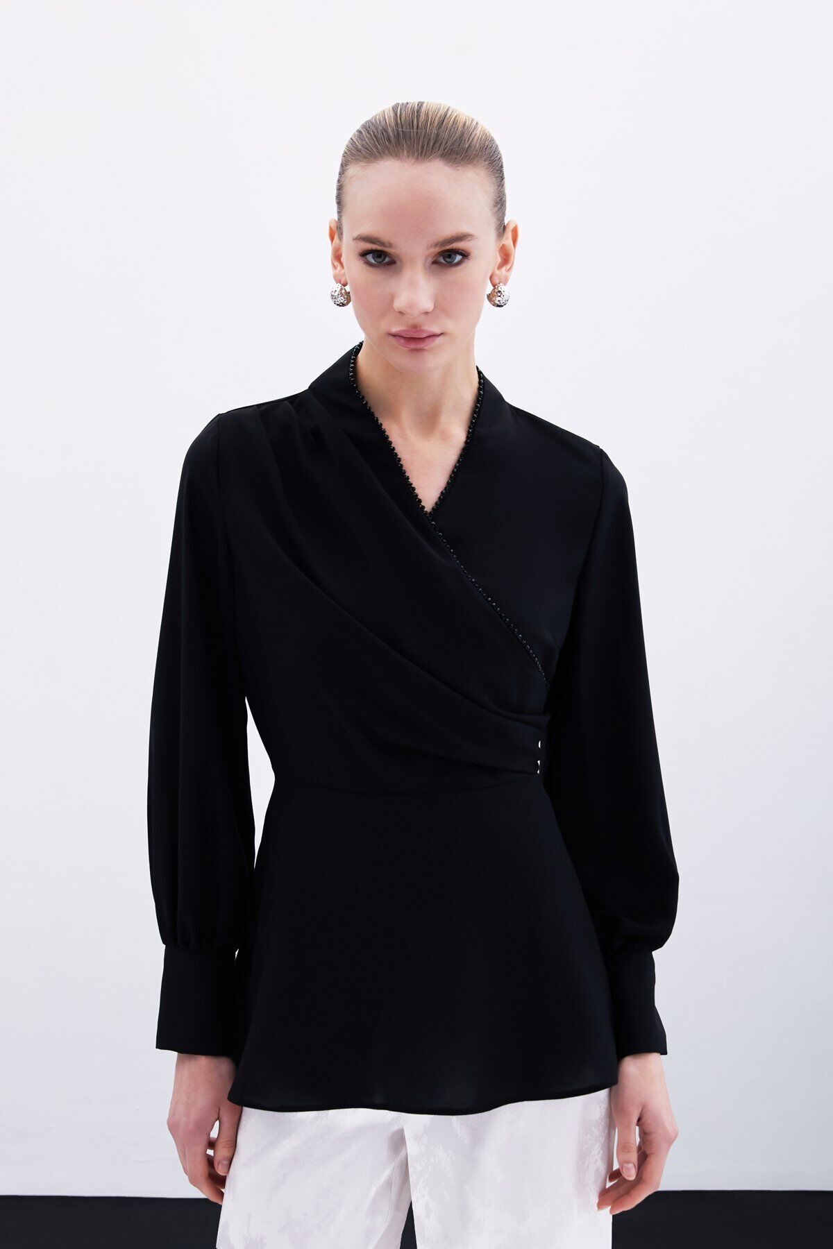 Boncuklu Yaka Kruvaze Bluz