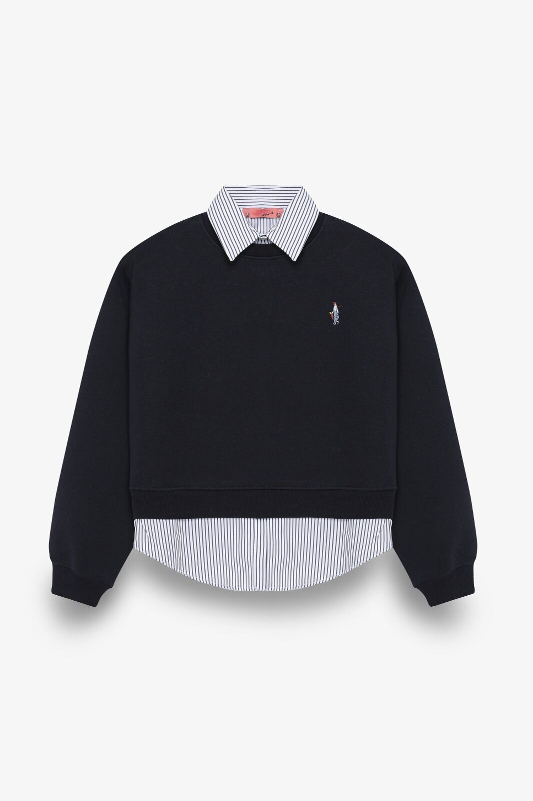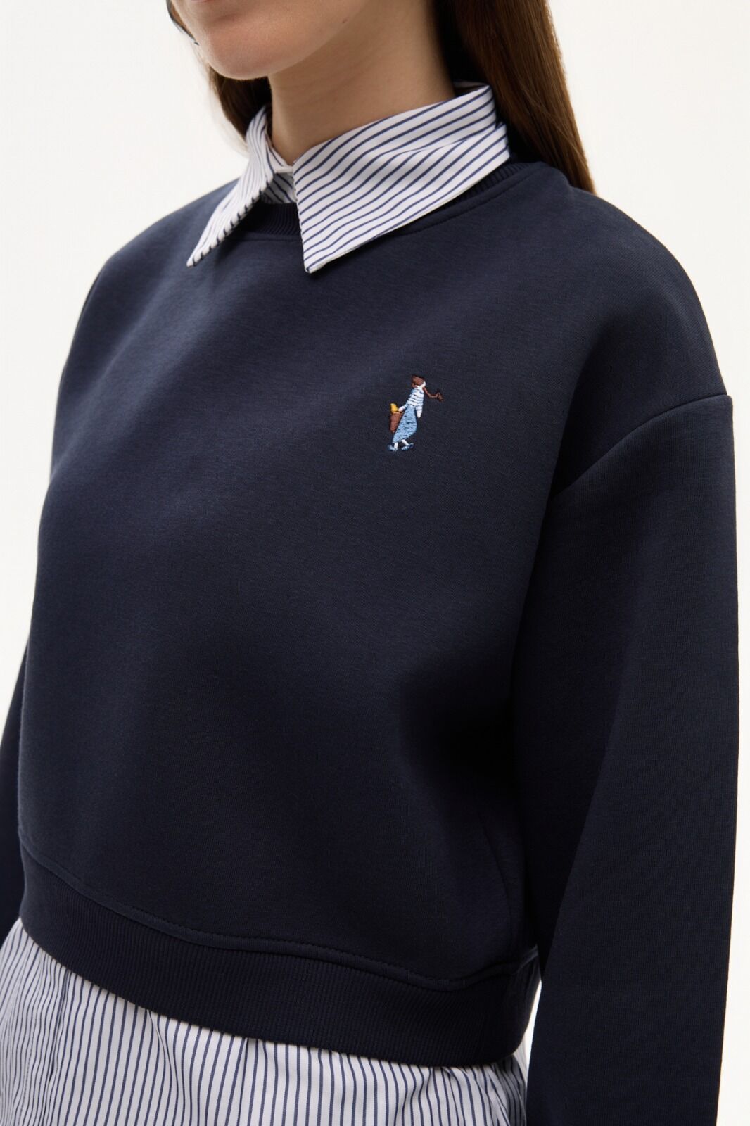 Gömlek yaka detaylı, göğüs kısmında küçük nakışlı,çizgili detaylı sweatsirt.