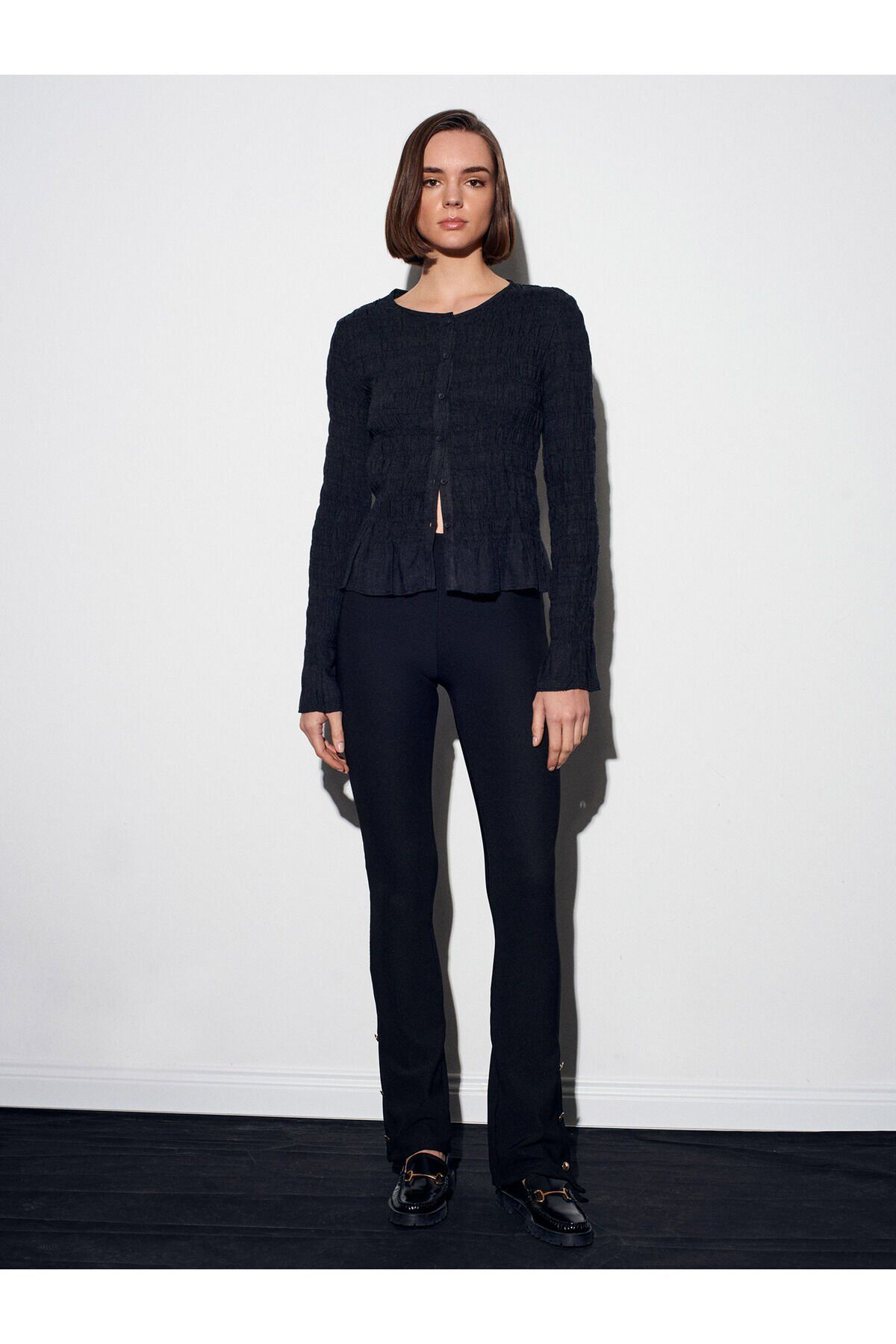 Ürün İçeriği : %96 Polyester %4 Elastan Mankenin Ölçüleri : Boy : 179 Göğüs : 85 Bel : 63 Kalça : 90 Numune Bedeni : 36/Standart Ürün Ölçüleri : Boy : 110 cm İç Bacak : 86 cm Bel : 31 cm