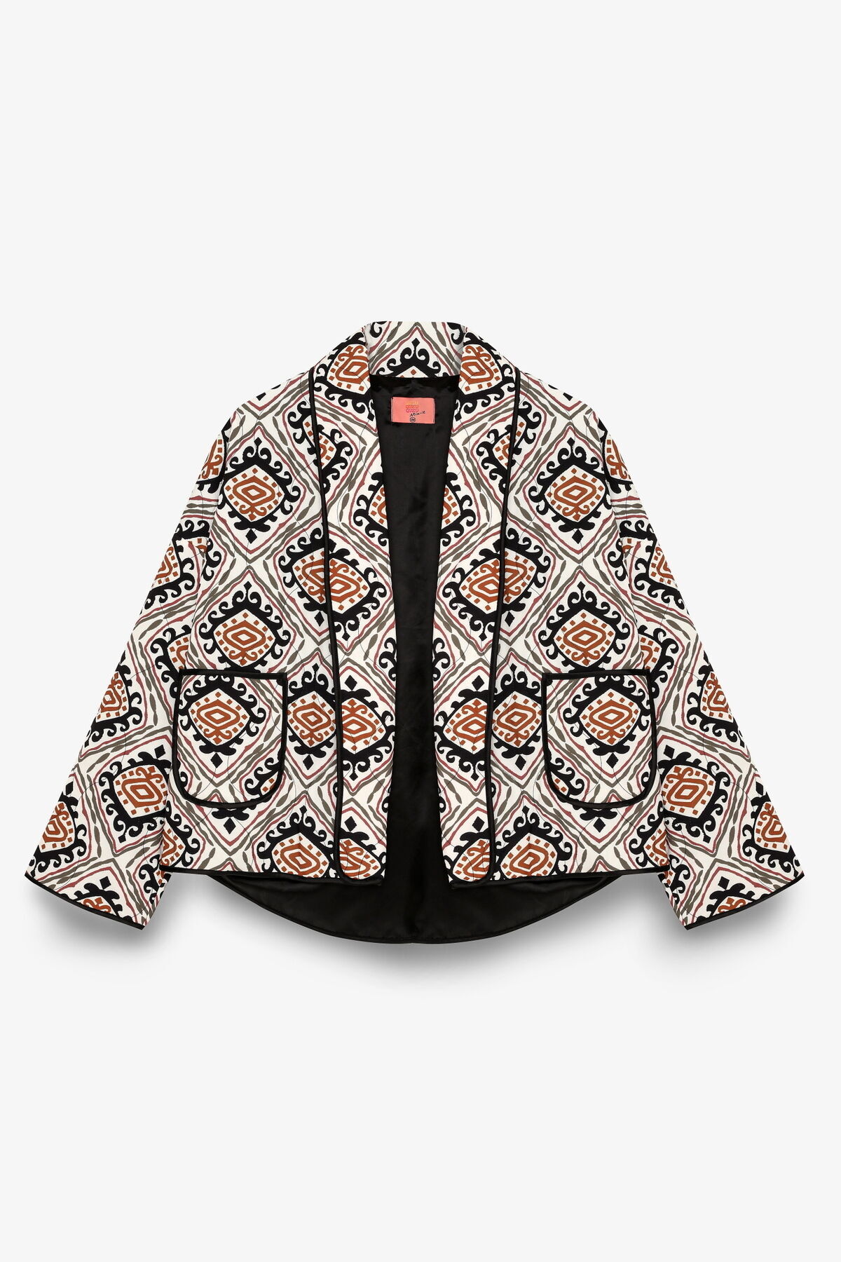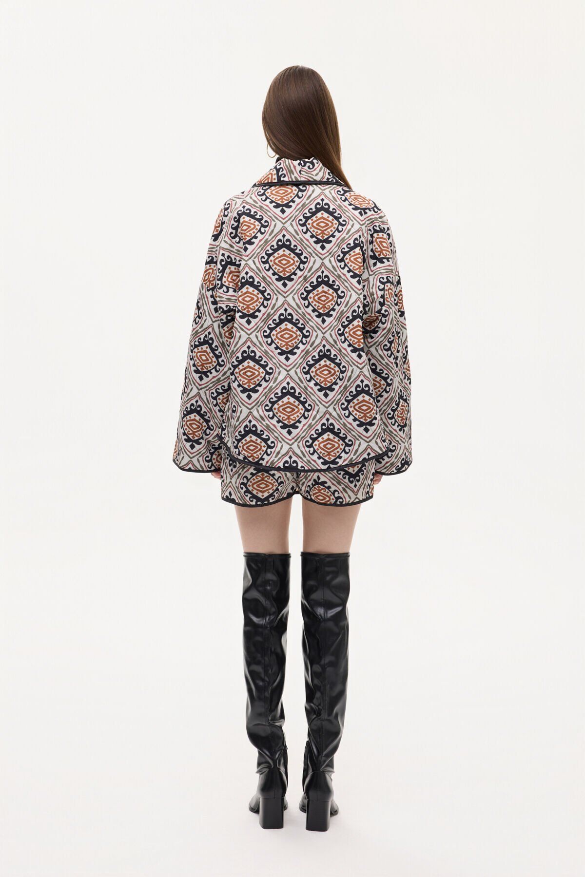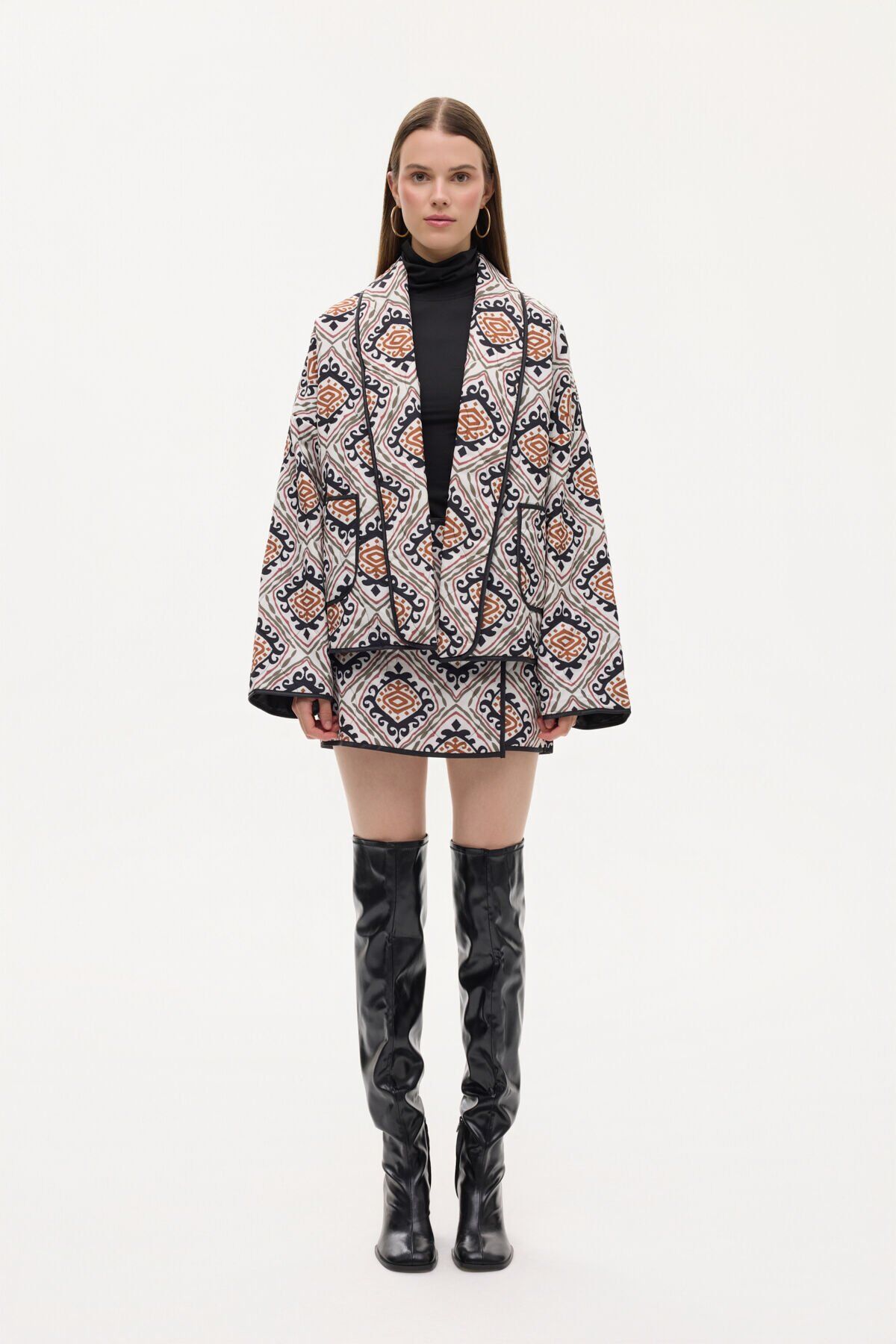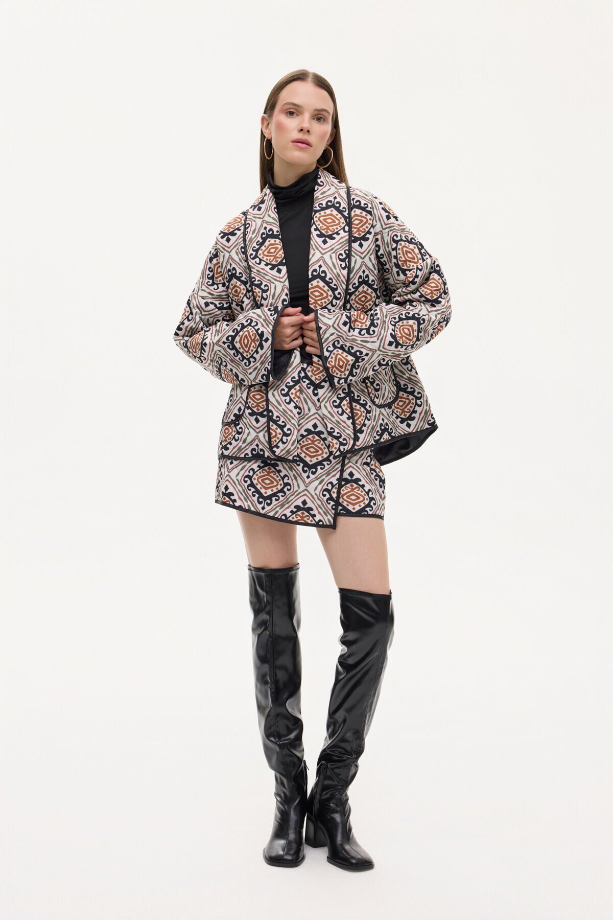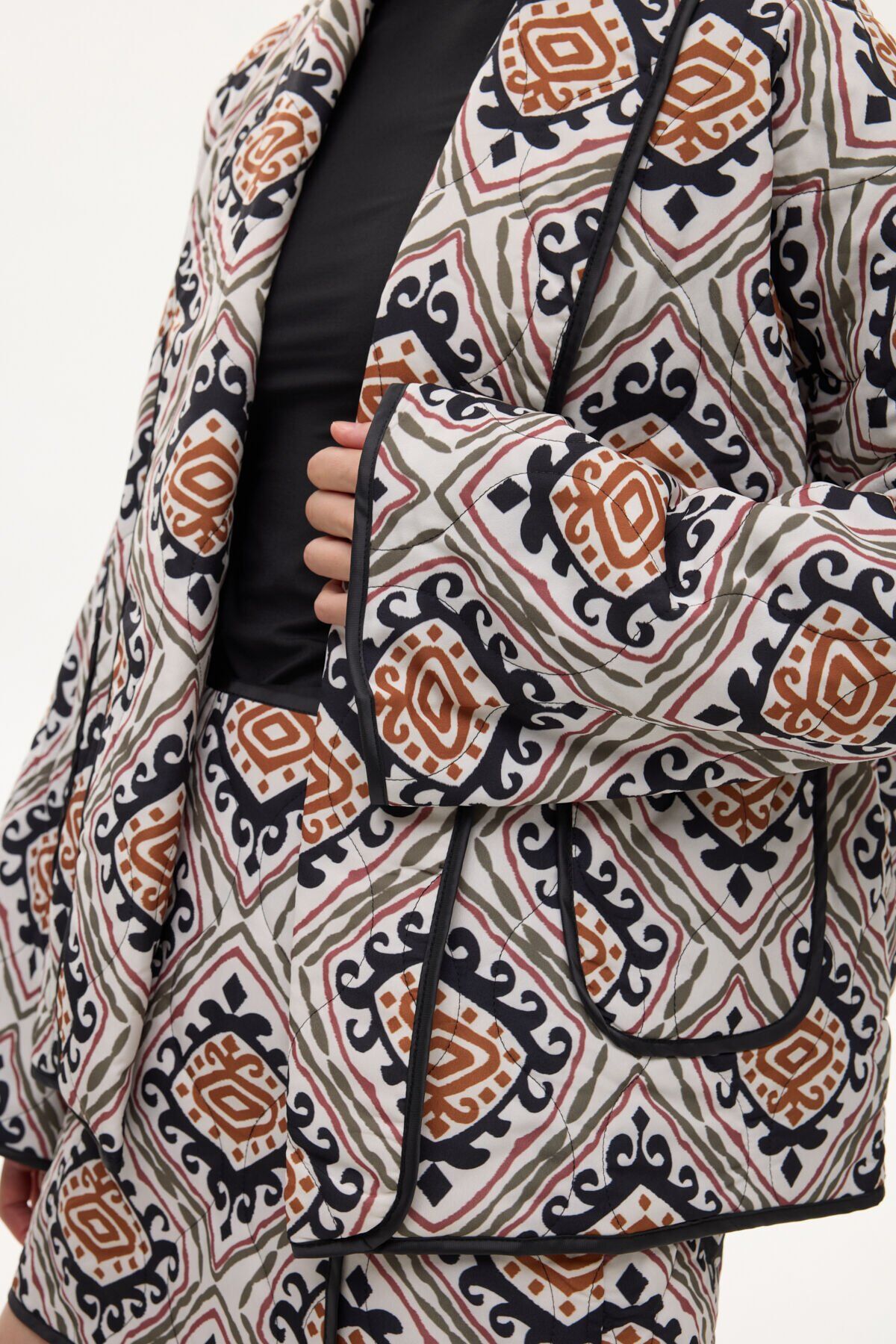 Etnik Desenli Biye Detaylı Kapitone Ceket