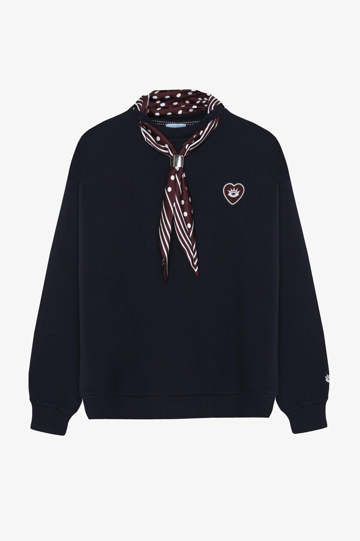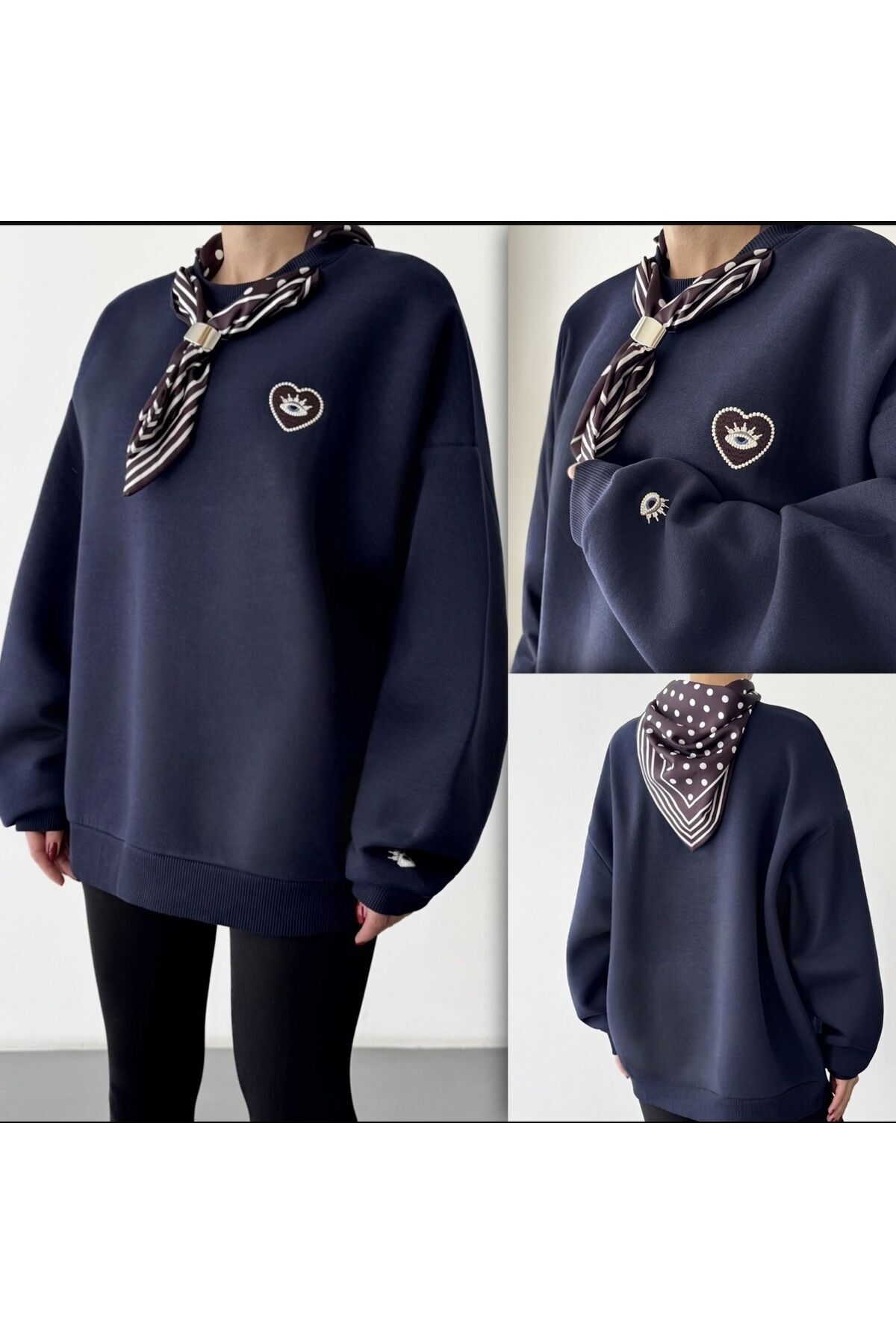 - şıklığı ve rahatlığı bir arada sunan oversize sweatshirt, günlük kullanım için idealdir.; - Fular detayı ve nakış işlemeli tasarımıyla stil sahibi görünüm kazandırırken, aynı zamanda konforlu bir deneyim sağlar.; - Kapamasız yapısı sayesinde pratik kullanım imkanı sunar; kolayca giyilip çıkarılabilir.; - Bisiklet yakası ile modern ve spor bir tarza sahip olan bu sweatshirt, casual ortamlarda rahatlıkla tercih edilebilir.; - Uzun kollu tasarım soğuk havalarda ekstra koruma sağlarken, regular silueti vücut hatlarını nazikçe sarar.; - Basic koleksiyonun parçası olarak her gardıropta temel parça haline gelir; farklı aksesuarlarla kombinlenebilir.; - Pamuk polyester karışımı materyali sayesinde dayanıklılık ve yumuşaklık bir arada sunulurken, oversize kalıp geniş kesimiyle hareket özgürlüğü tanır.; - Normal boy uzunluğu ile farklı vücut tiplerine uyum sağlayarak herkes tarafından rahatlıkla kullanılabilir.; - Kadın / kız kullanıcılar için tasarlanmış olup, yetişkin yaş grubuna hitap eder.; - Dokuma kumaş tipi kaliteli hissiyat vererek uzun süreli kullanım vaat eder.;