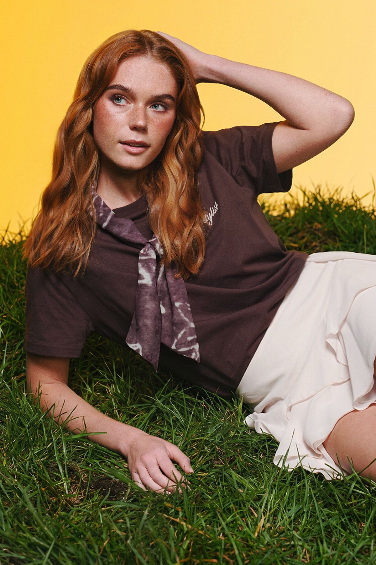 Fularlı Yazı Nakışlı Oversize Tişört Kahverengi