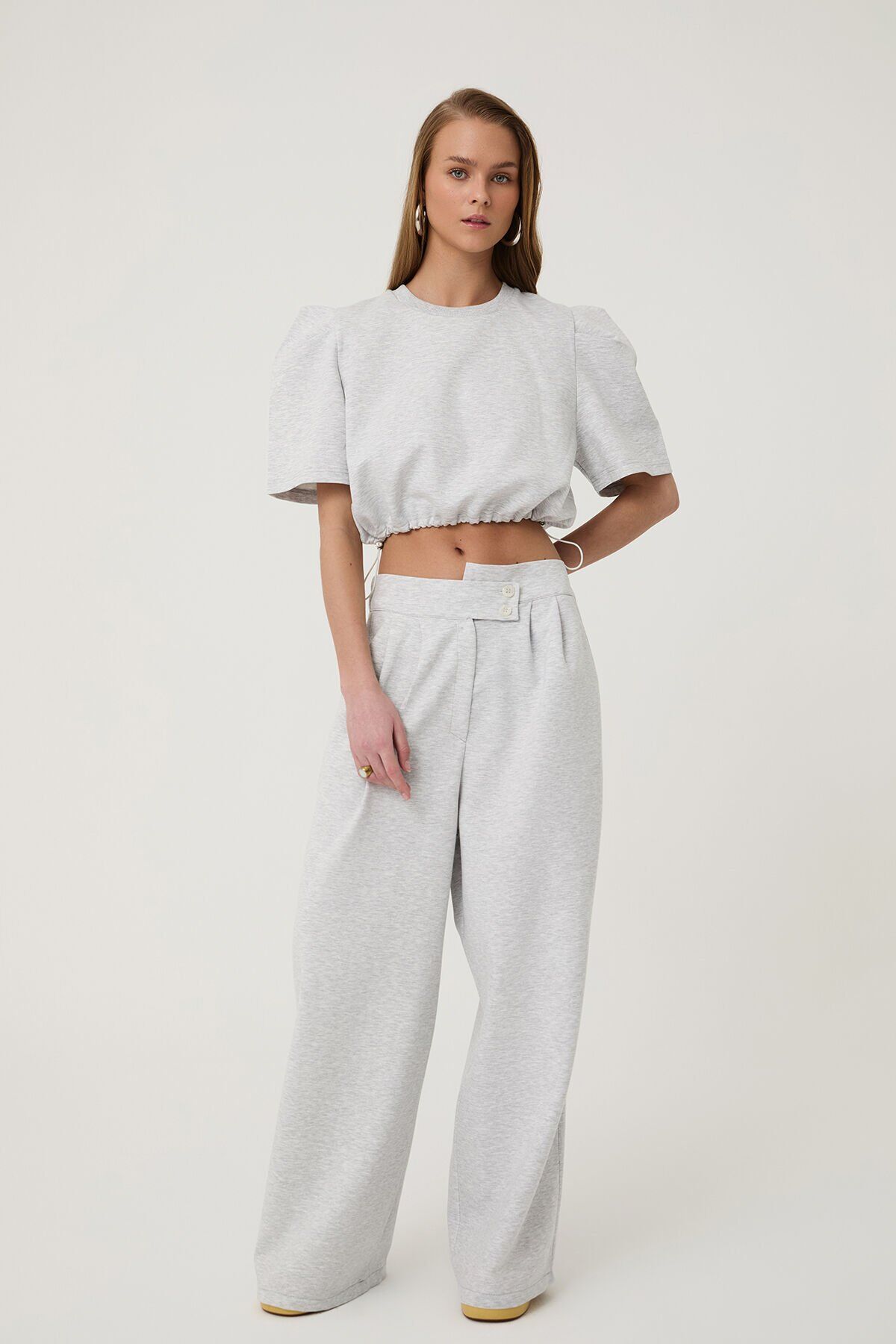 Rahat kesimi ve bol paça tasarımı ile günlük kullanım için ideal olan bu gri eşofman pantolon, hareket özgürlüğünüzü kısıtlamaz; Yüksek bel tasarımı sayesinde konforlu bir oturuş sunar ve vücut hatlarınıza mükemmel uyum sağlar; Pratik cepli yapısı, kişisel eşyalarınızı yanınızda taşımanız için kolaylık sağlar; Dokuma kumaş tipi, dayanıklılığı artırırken orta kalınlığıyla mevsim geçişlerinde ideal bir seçenek oluşturur; Pamuk ve polyester karışımından üretilen materyali, nefes alabilirlik ve yumuşaklık sunarak gün boyu rahat etmenizi sağlar; Düz deseni ve gri rengiyle kolayca kombinlenebilir; her tür üst giyimle uyum içinde şık bir görünüm elde edersiniz; Basic koleksiyonun bir parçası olarak, zamansız tarzınıza uyum sağlayacak minimalist bir tasarıma sahiptir; Yıkama talimatlarına uygun bakım ile uzun süreli kullanımın keyfini çıkartabilirsiniz;