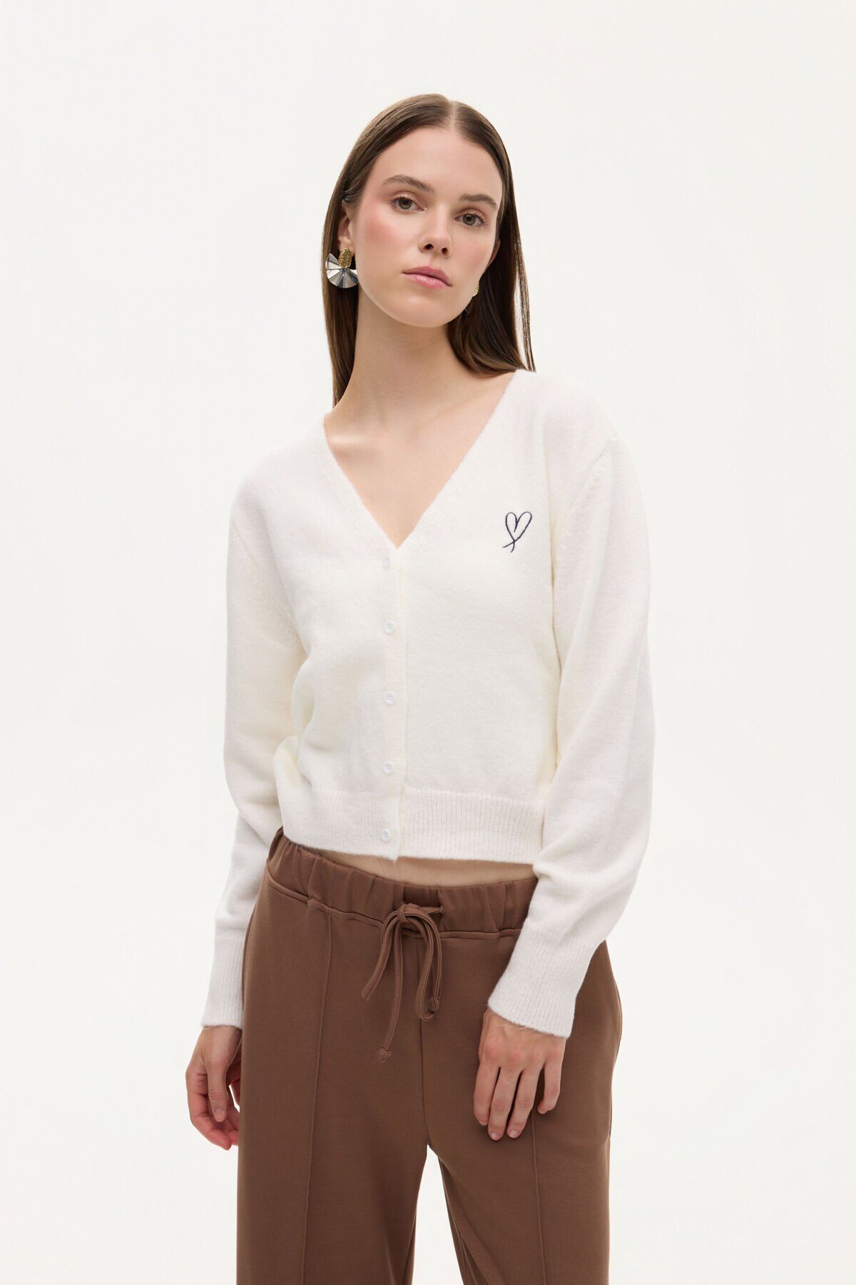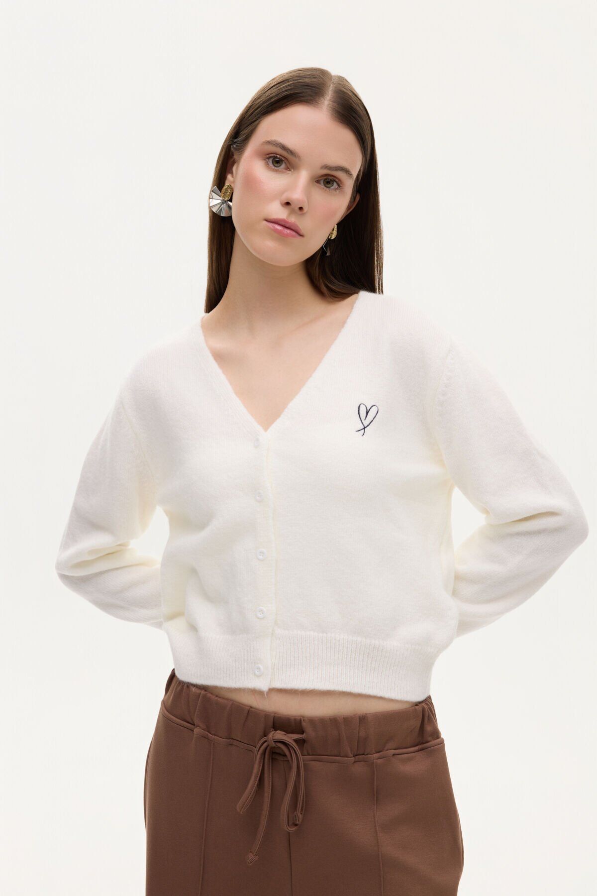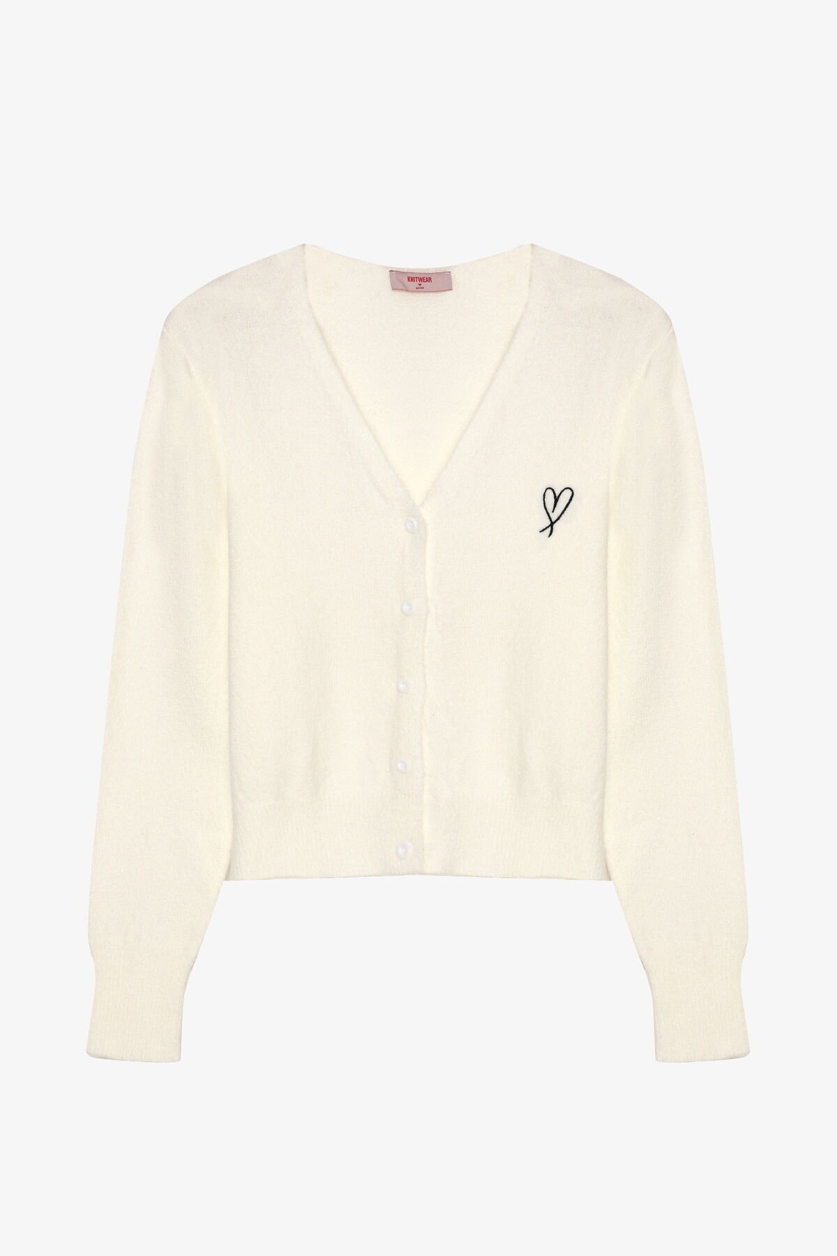Kalp Nakışlı Düğmeli V Yaka Triko Hırka