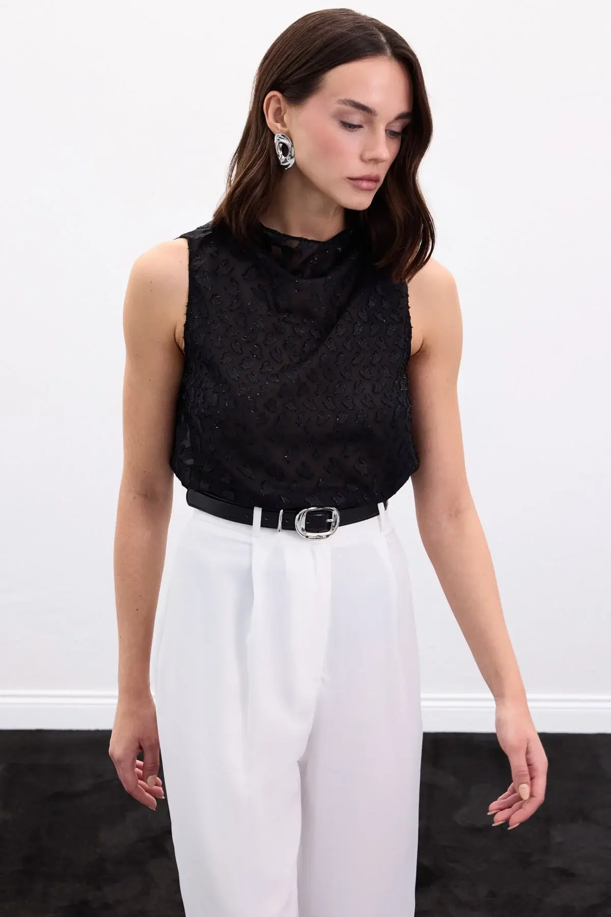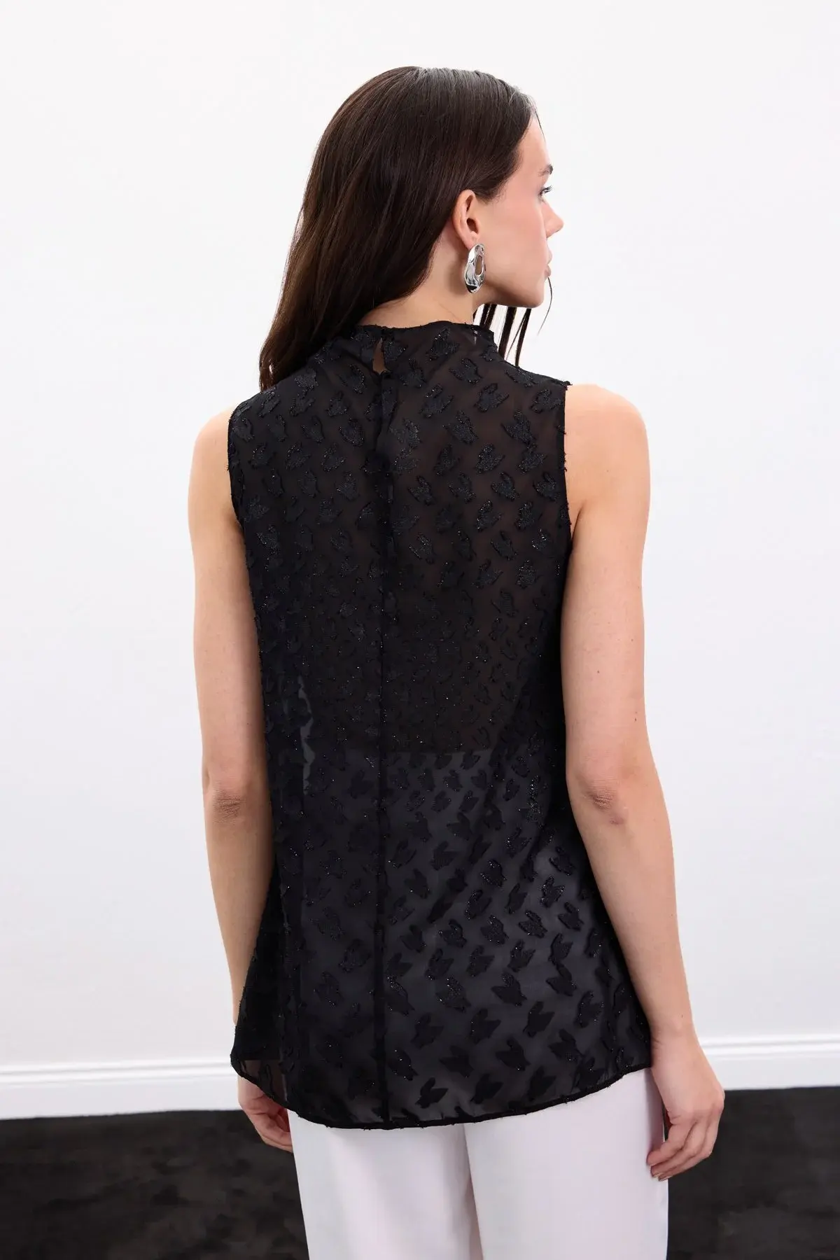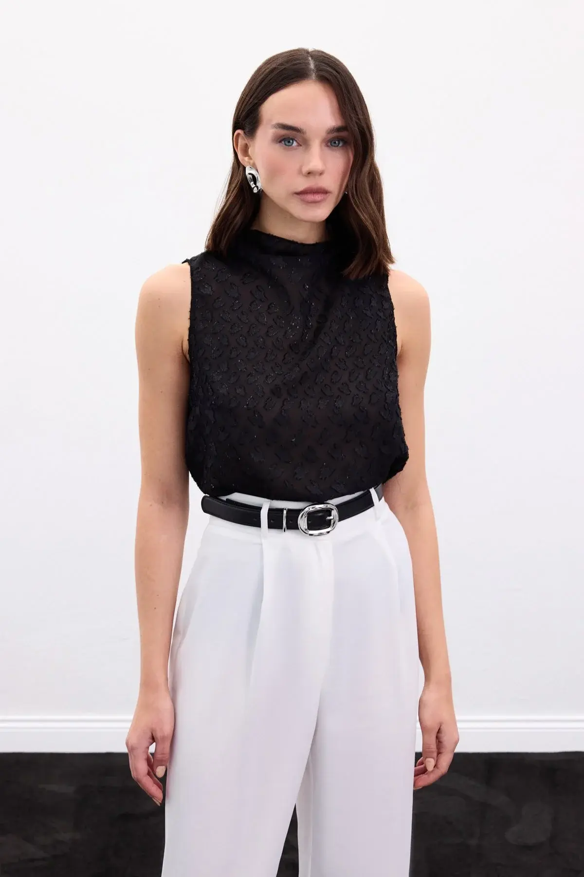 Siyahın zamansız şıklığını dokulu detaylarla buluşturan Kolsuz Dokulu Bluz, gardırobunuzun favori parçalarından biri olmaya aday. Dokuma kumaşı, kolsuz tasarımı ve dik yakasıyla hem günlük hem de şık kombinlerde rahatlıkla tercih edilebilir.