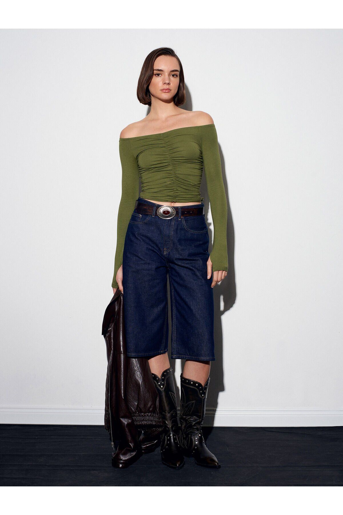 Ürün İçeriği : %51 Pamuk %45 Lyocell %4 Elastan Mankenin Ölçüleri : Boy : 179 Göğüs : 85 Bel : 63 Kalça : 90 Numune Bedeni : 36/Standart Ürün Ölçüleri : Boy : 44 cm Gögüs : 30 cm Kol : 62 cm