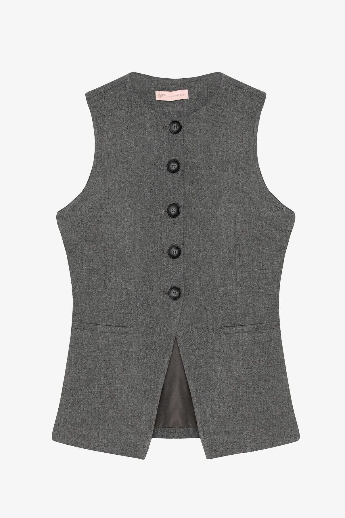 Ön Yırtmaç Detaylı Yuvarlak Yaka Düğmeli Yelek Ceket