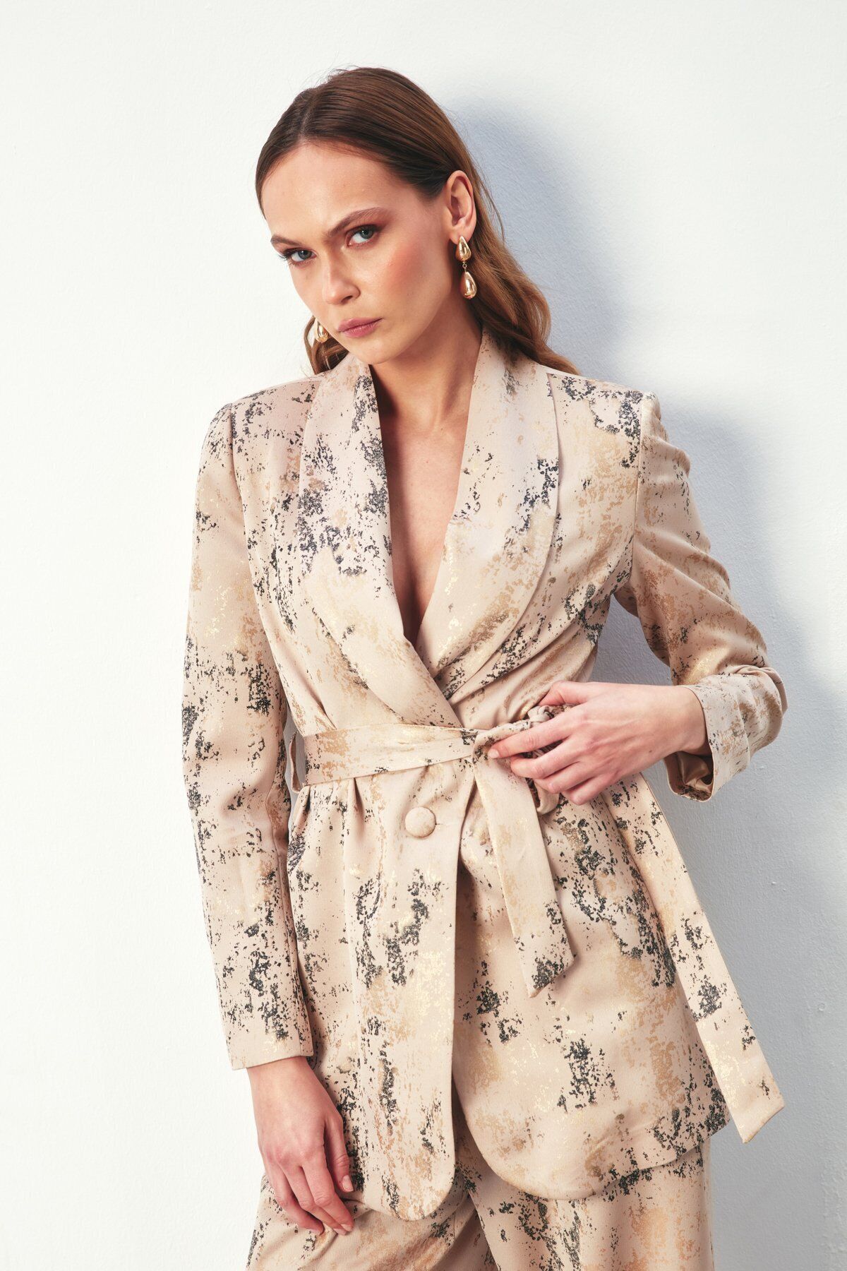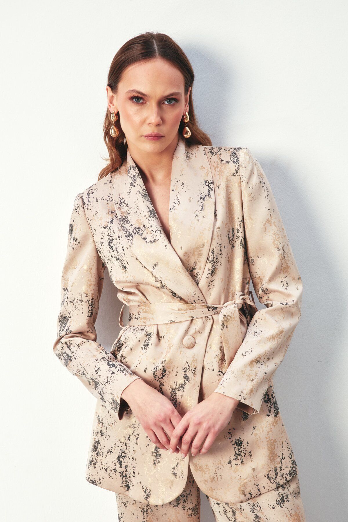 Parlak Desenli Kuşaklı Uzun Ceket