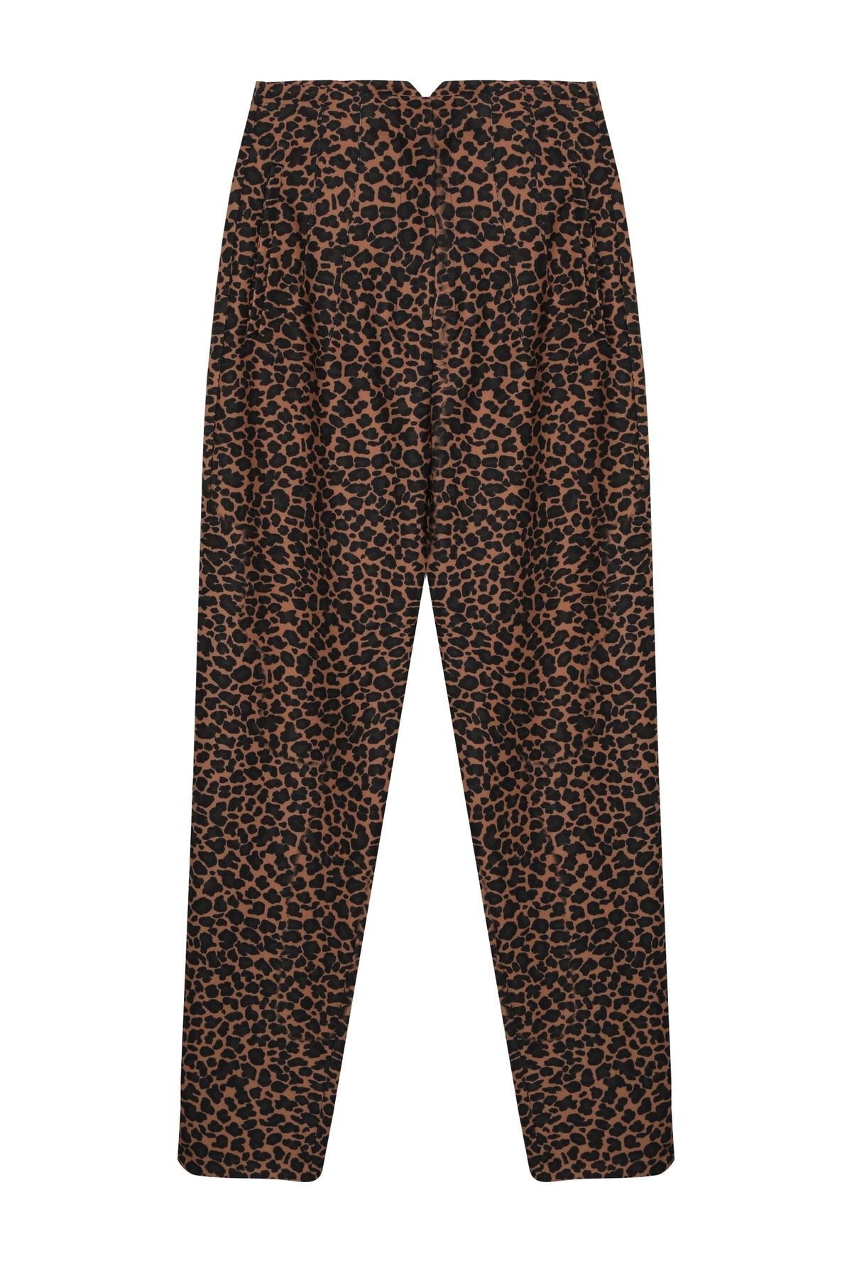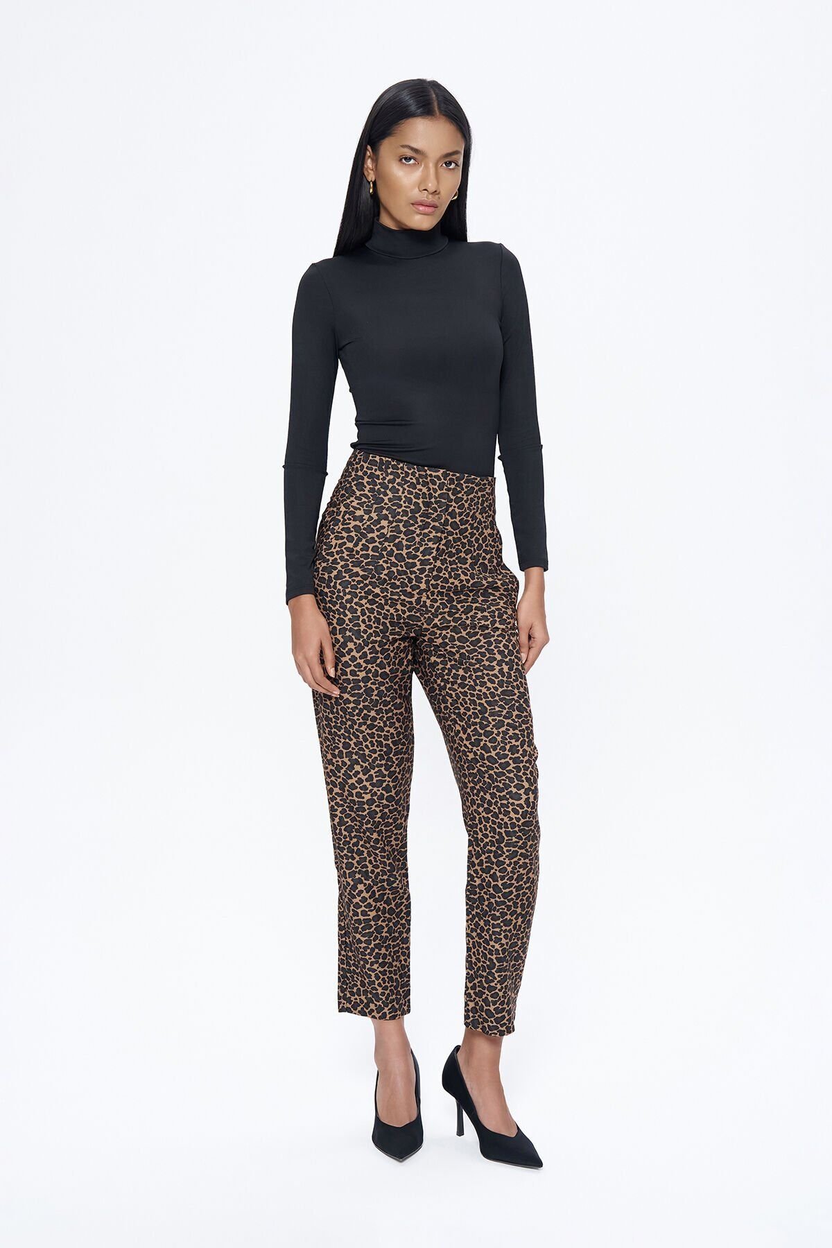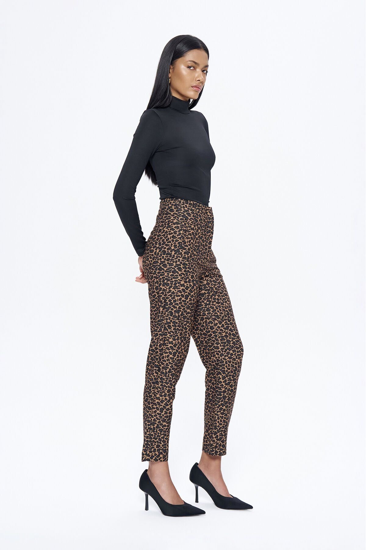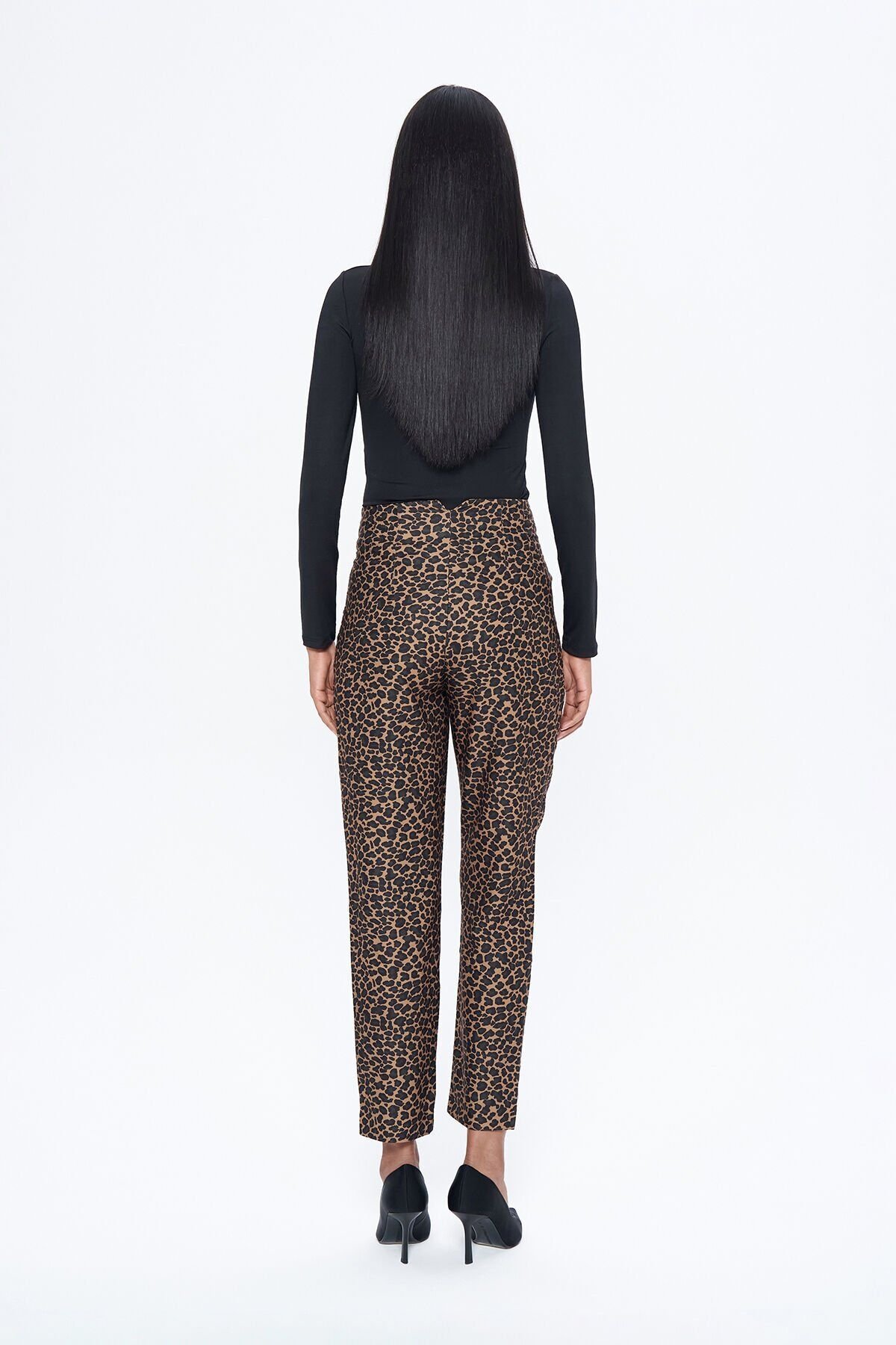 Dokuma kumaş yapısı ile konforlu bir kullanım sunar ve ince yapısı sayesinde hafif ve rahat bir his sağlar; Klasik kalıbı, zamansız bir şıklık yaratırken, slim fit kesimi modern bir görünüm kazandırır; Günlük kullanıma uygun tasarımı ile casual ortamlarda rahatlıkla tercih edilebilir; leopar deseniyle dikkat çekici bir stil oluşturur; Yüksek bel tasarımı sayesinde vücut hatlarını zarifçe sararak feminen bir siluet sunar; Cigarette silueti, sofistike ve şık bir duruş sergilerken, regular boy kesimiyle farklı vücut tiplerine uyum sağlar;