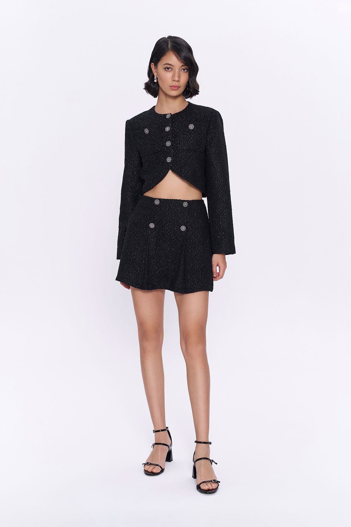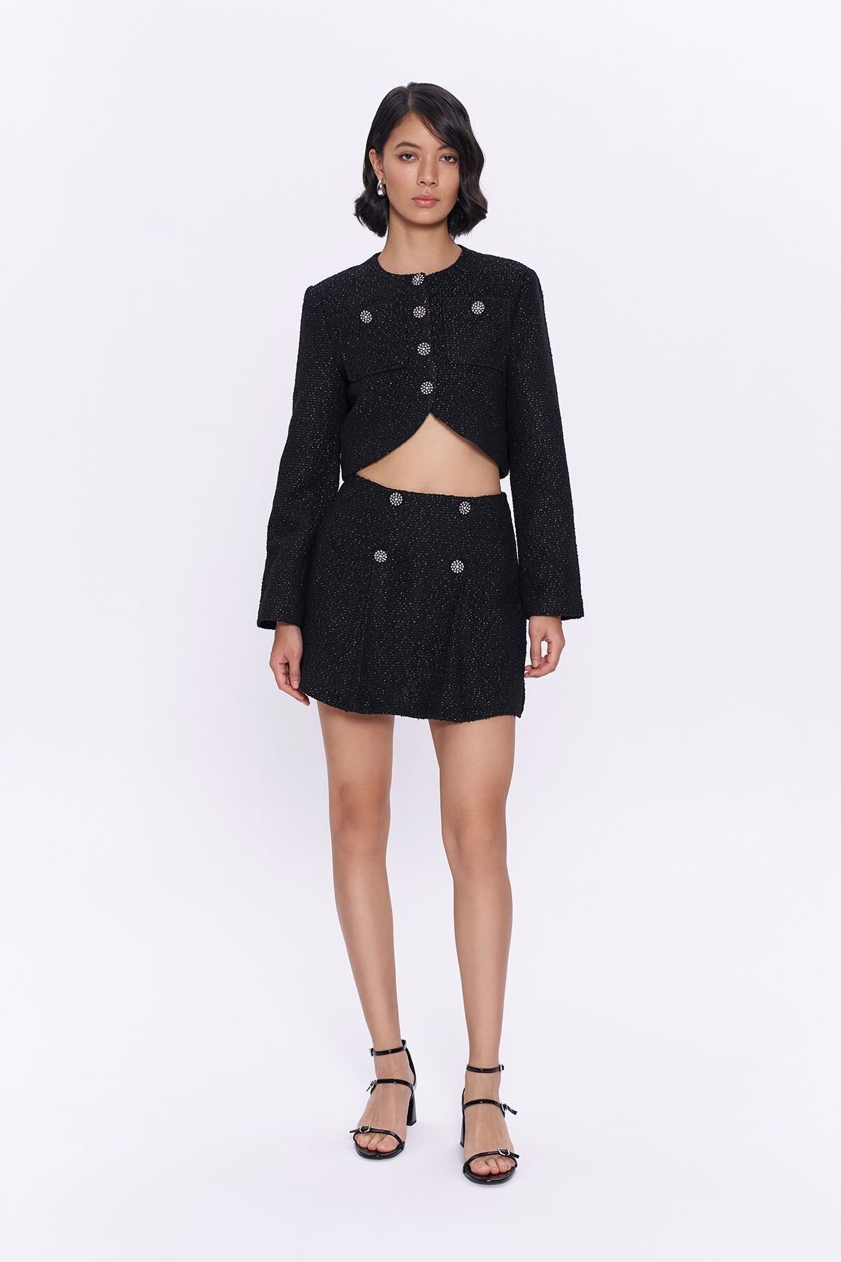 Dokuma kumaş yapısı ile dayanıklılığı ve konforu bir arada sunar; Mini boy kesimiyle modern ve şık bir görünüm sağlar; Yüksek bel tasarımı sayesinde vücut hatlarını zarifçe sarar ve şıklığınızı ön plana çıkarır;
